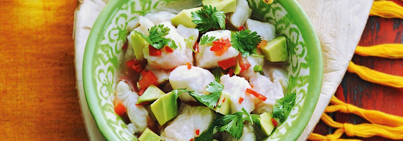 Aguachile mexicano (eglefino cocido en lima) con pimiento rojo y chips de tortilla