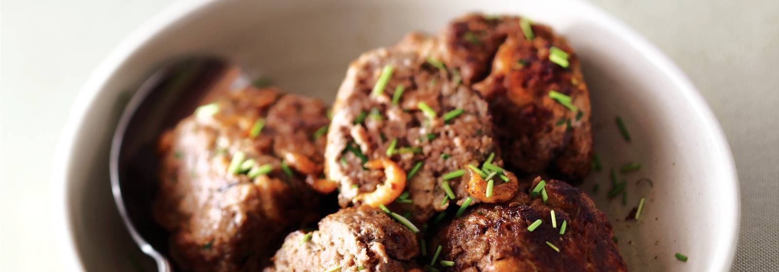 Divide la carne en 4 porciones y forma bolas con las manos húmedas. Calentar la mantequilla en una sartén y freír las albóndigas a fuego medio en 4 minutos. Deje que se cocinen a fuego lento durante 20 minutos. Tiempos regularmente. Espolvorear antes de servir con el resto de las cebolletas. Delicioso con ensalada de frijoles y papas al curry.
