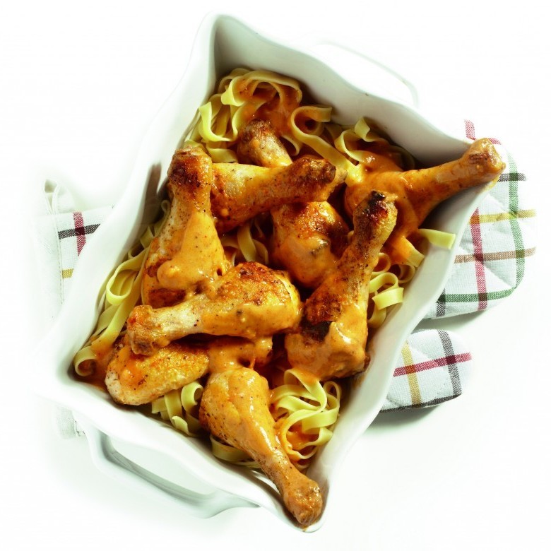 Lleve la salsa al gusto con sal y pimienta y sirva el pollo con la salsa y la pasta.
