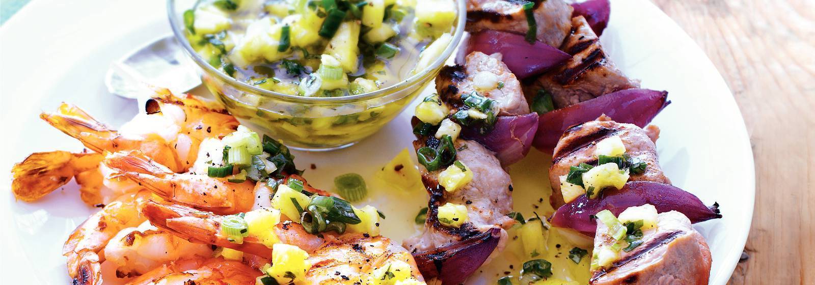 Una sabrosa receta americana. El plato principal contiene los siguientes ingredientes: carne, langostinos (sin pelar (bolsa 500 g, congelados), descongelados), piña (limpiada), albahaca ((plato de 15 g), hoja cortada), cebolla tierna ((3 piezas), picada), Aceite de oliva virgen extra, solomillo y cebollas rojas (cada una en 6 partes).
