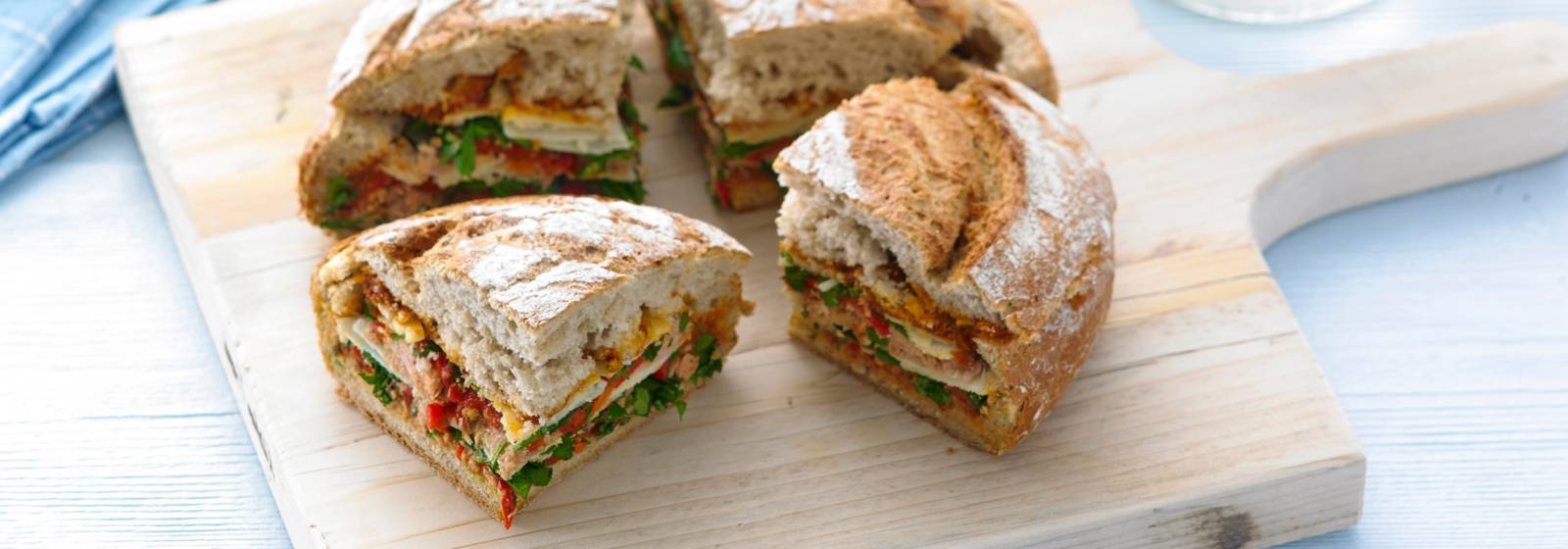 Pan de picnic con atún, pimientos, tapenade y apio.