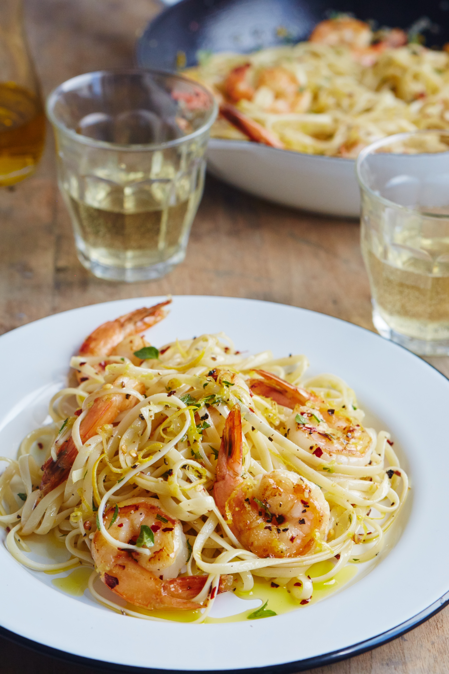 Retire los camarones del horno, transfiéralos a la cacerola con la salsa de limón y orégano, y mezcle para combinar. Sirva de inmediato sobre la pasta cocida, el arroz, el cuscús o la polenta cremosa.