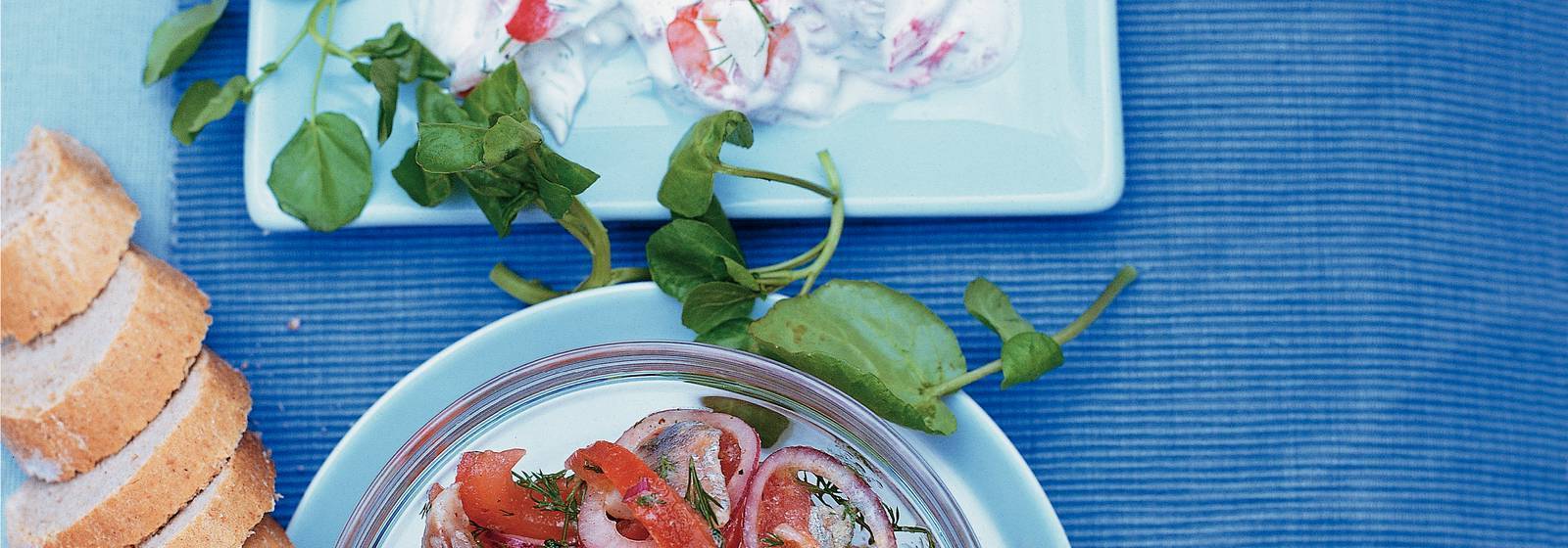Una deliciosa receta escandinava. La guarnición contiene los siguientes ingredientes: pescado, eneldo fresco (15 g), escamas de surimi (125 g), camarones rosados (à 125 g), jerez mediano seco, crema batida, sal y pimienta recién molida y berros (75 g).