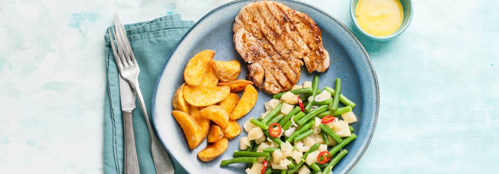 Chuletas de cerdo a la parrilla con ensalada de piña y frijoles franceses y gajos de papa