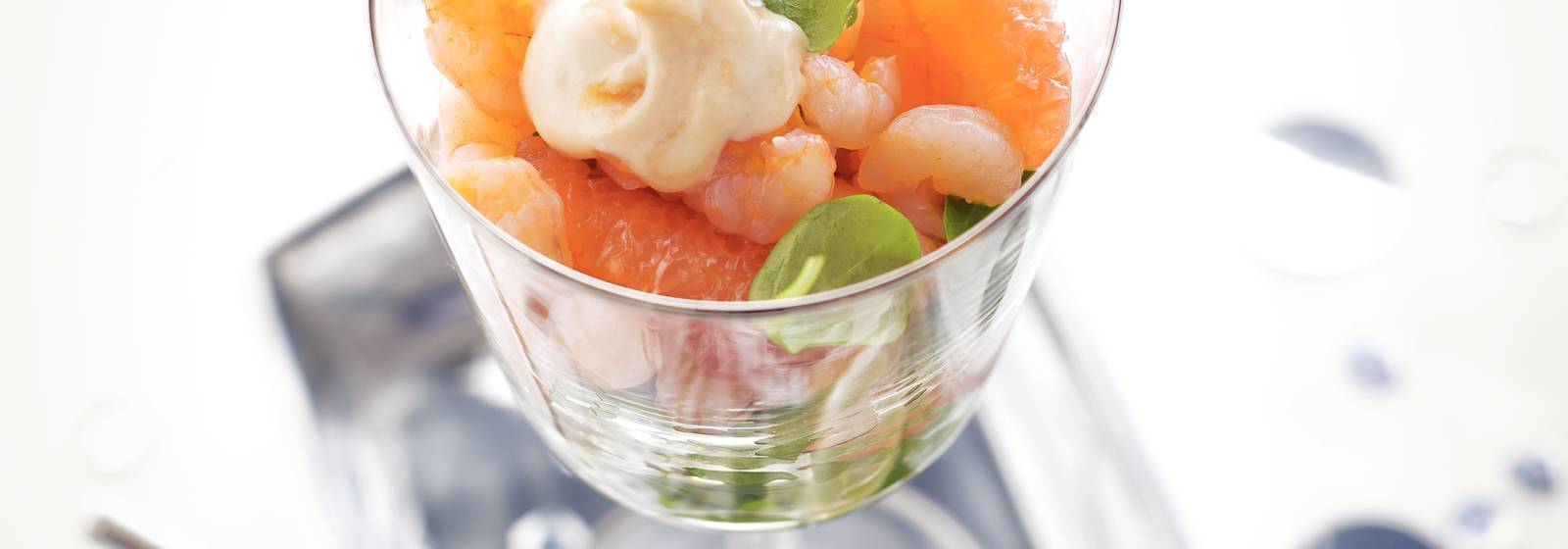 Divida la toronja, la lechuga de cordero y ambos tipos de camarones sobre los vasos. Deja 4 camarones jumbo para adornar.