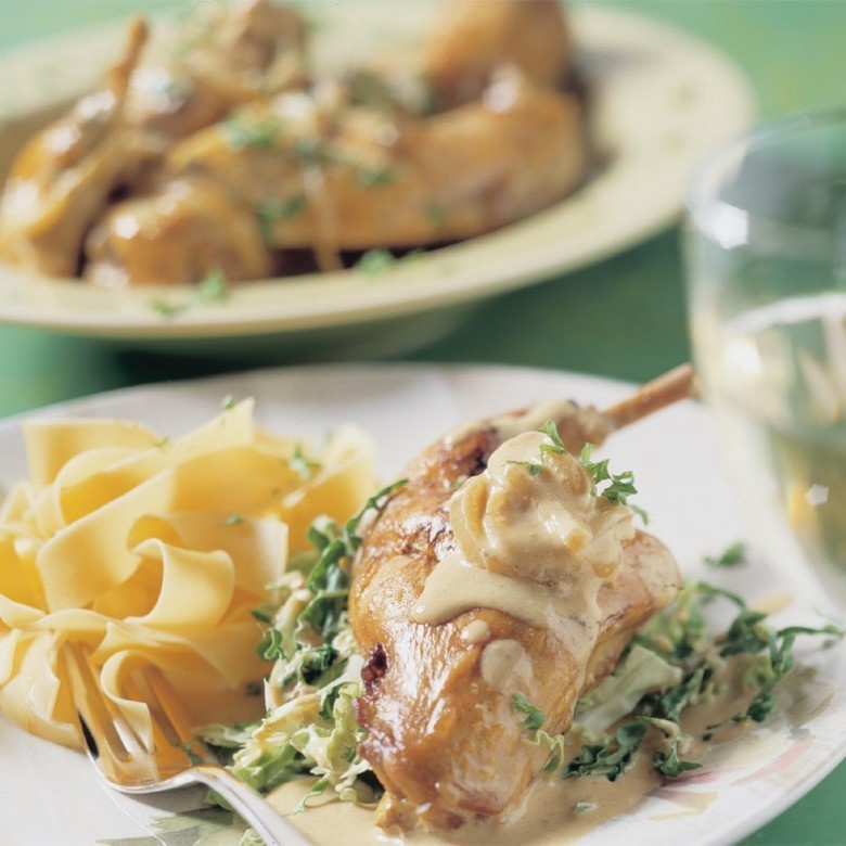 Divide los pernos de conejo y las brasas sobre las placas. Vierta la salsa de mostaza sobre la carne. Sirva con este plato, por ejemplo, tallarines o puré de papas.