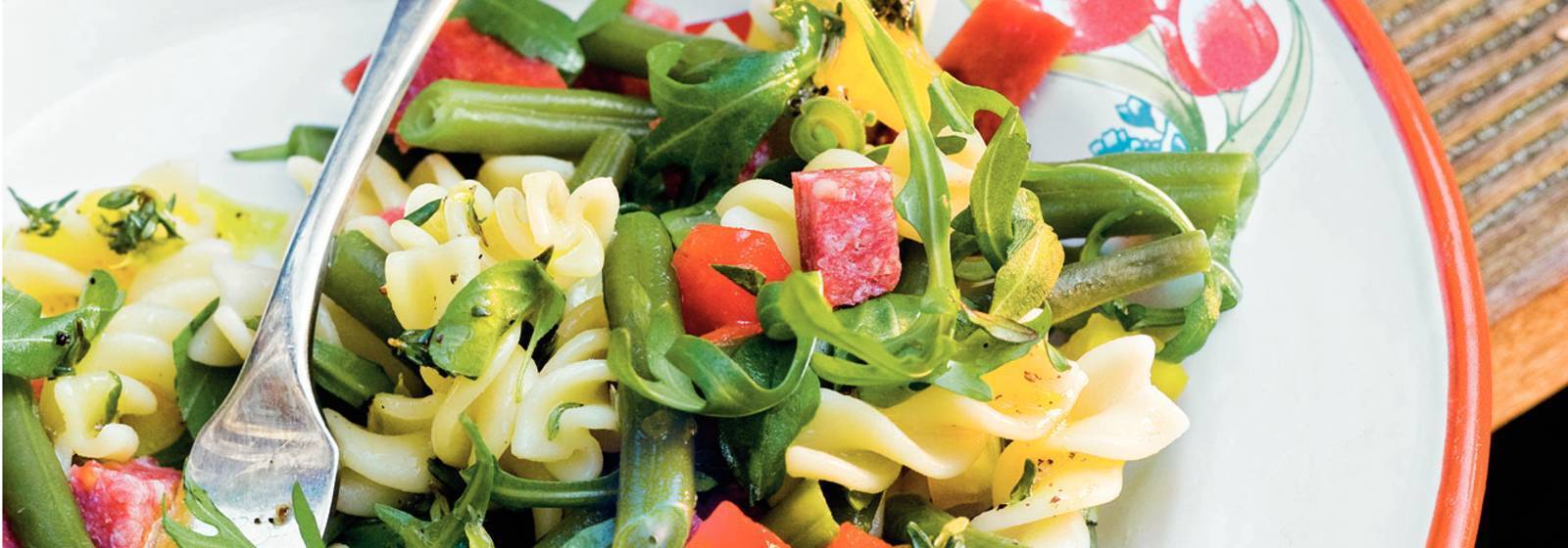 Ensalada de pasta con salami, pimientos, judías verdes y rúcula