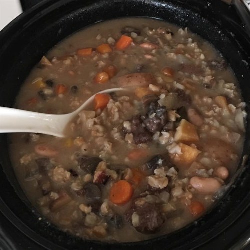 80 minSopas, Guisos Y Chilipetróleo, tocino, cebolla, zanahorias, apio, sal pimienta, comino, tomillo, pimienta de cayena, lentejas beluga, caldo, bahía, perejil dividido, petróleo,sopa de lentejas negras del chef john -