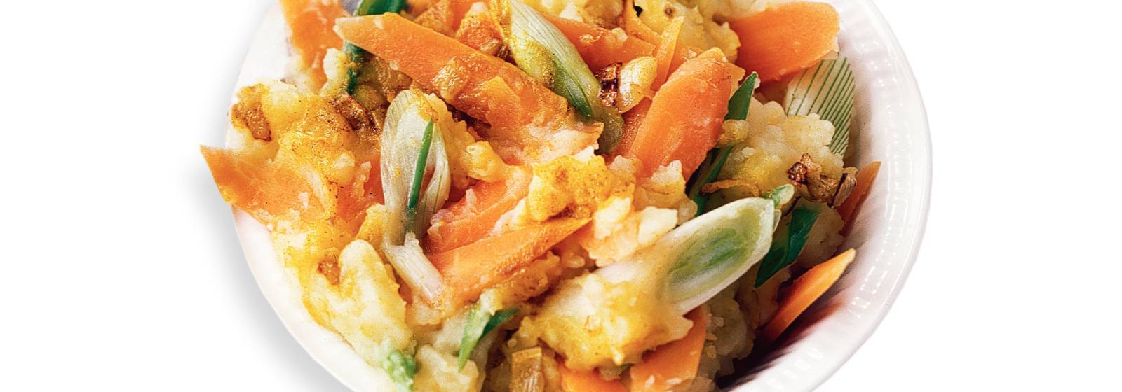 Una sabrosa receta holandesa. El plato principal vegetariano contiene los siguientes ingredientes: papas (peladas), mantequilla, cebollas (picadas), zanahorias (verdes eliminadas y raíces lavadas y en rodajas oblicuas), ajo (prensado), curry en polvo, cebolleta ((3 piezas) y en rodajas inclinadas ).
