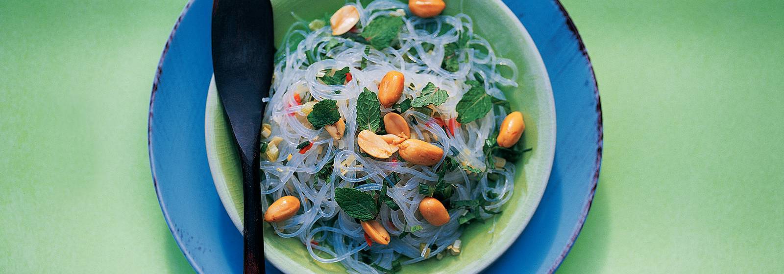 Poner el agua a hervir en la sartén. Corte el Mihoen en trozos grandes y agregue 1/2 cucharada de aceite al agua de cocción. Deje que el agua vuelva a hervir y hierva durante 15 segundos. Escurrir Mihoen, enjuagar con agua fría y dejar que escurra. Retire las hojas exteriores de limoncillo, pique los tallos. La cáscara del ajo y picar finamente. Cortar la pimienta por la mitad, quitar las semillas y picar finamente. Limpiar las cebollas del bosque y cortar en aros. Corte con cuidado el cilantro y la mitad de la menta fresca, retire las ramitas restantes de hojas de menta fresca. Exprimiendo la lima. Tostar el marrón dorado en cacahuetes wok secos, dejar enfriar en el plato.