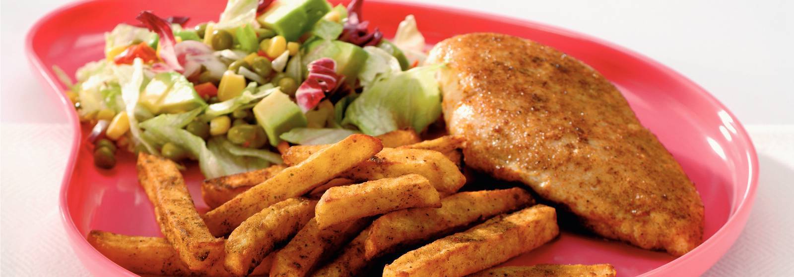 Una buena receta mexicana. El plato principal contiene los siguientes ingredientes: carne de ave, papas fritas congeladas, filete de pollo y mezcla de Bonduelle México enlatada.