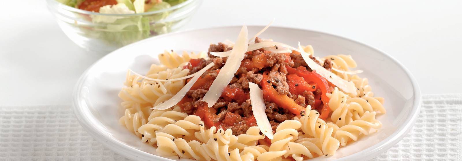 Fusilli con salsa de tomate y pimiento y carne picada.