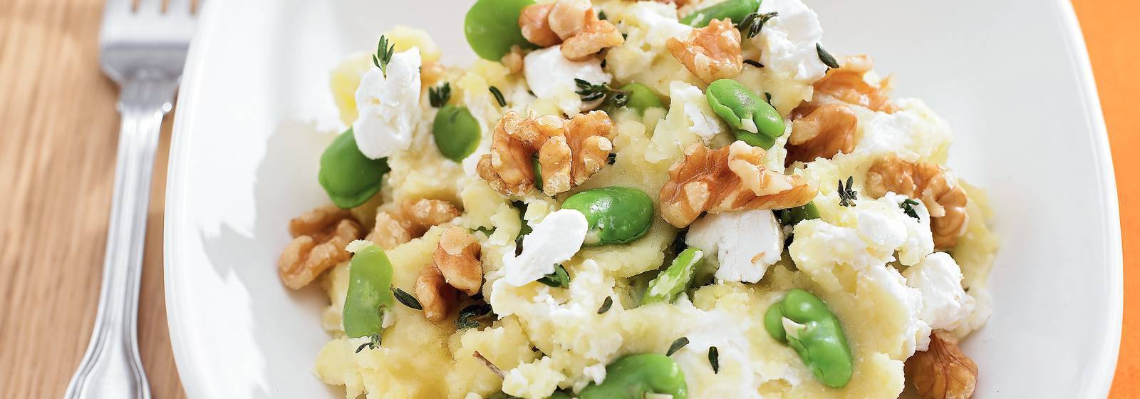 Una sabrosa receta holandesa. El plato principal vegetariano contiene los siguientes ingredientes: papas desmenuzables (peladas y en trozos), habas (congeladas), aceite de oliva, tomillo fresco (15 g), nueces, queso de cabra suave y miel líquida.