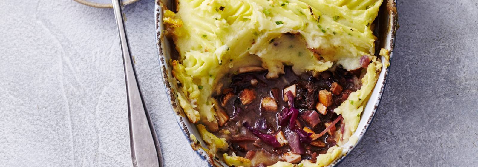 Con una cuchara, coloque el estofado de col roja en un plato de horno engrasado. Divida el puré uniformemente sobre él y tire de él con un tenedor.