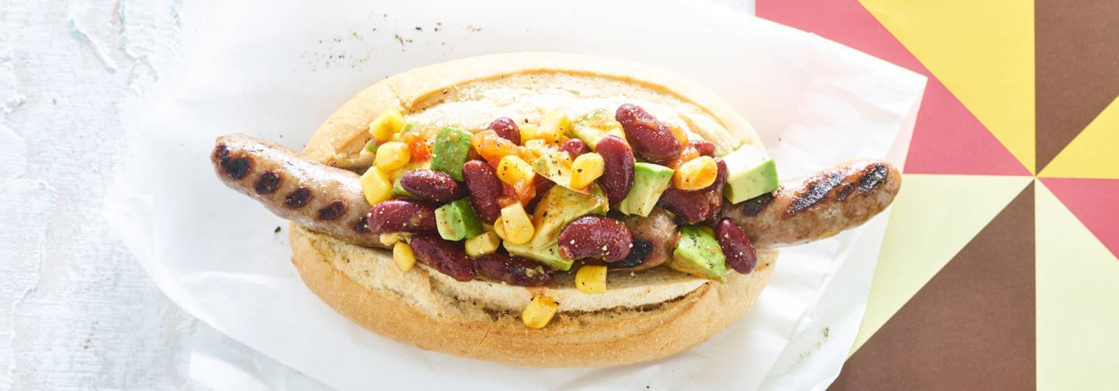 Perros calientes hechos de chipolata de res, frijoles, maíz, aguacate, salsa en pistolas blancas.