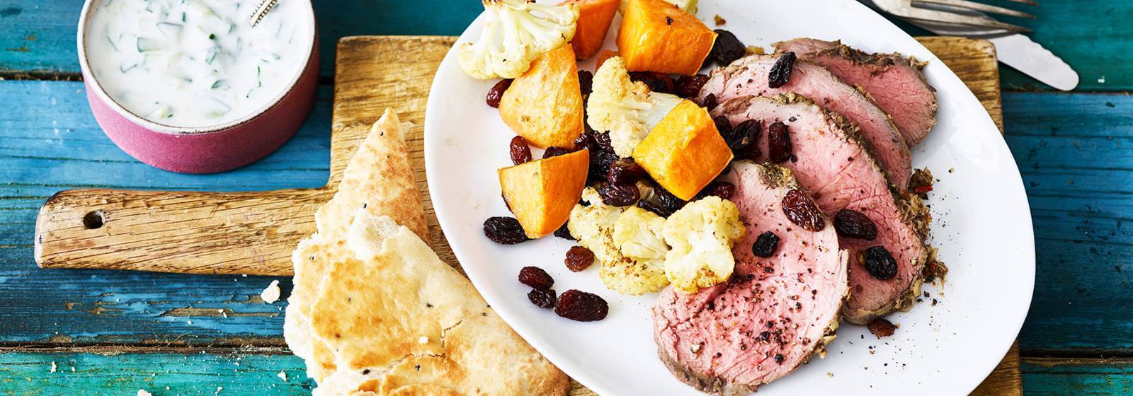 Pierna de cordero deshuesada marinada en una pasta de jengibre, garam masala, pimienta de cayena y ajo, con batata, coliflor, pasas y una salsa de yogur, menta, ajo y pepino, servida con naans.