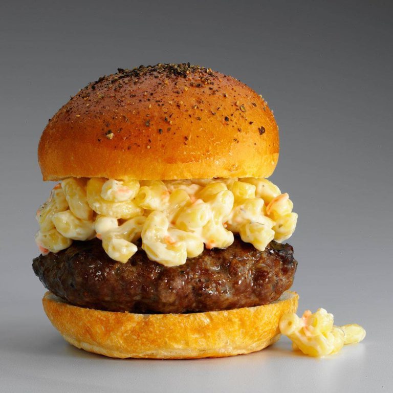 Toma una empanada totalmente estadounidense y cárgala al estilo de Hawaii al rematar tu hamburguesa con ensalada de macarrones.