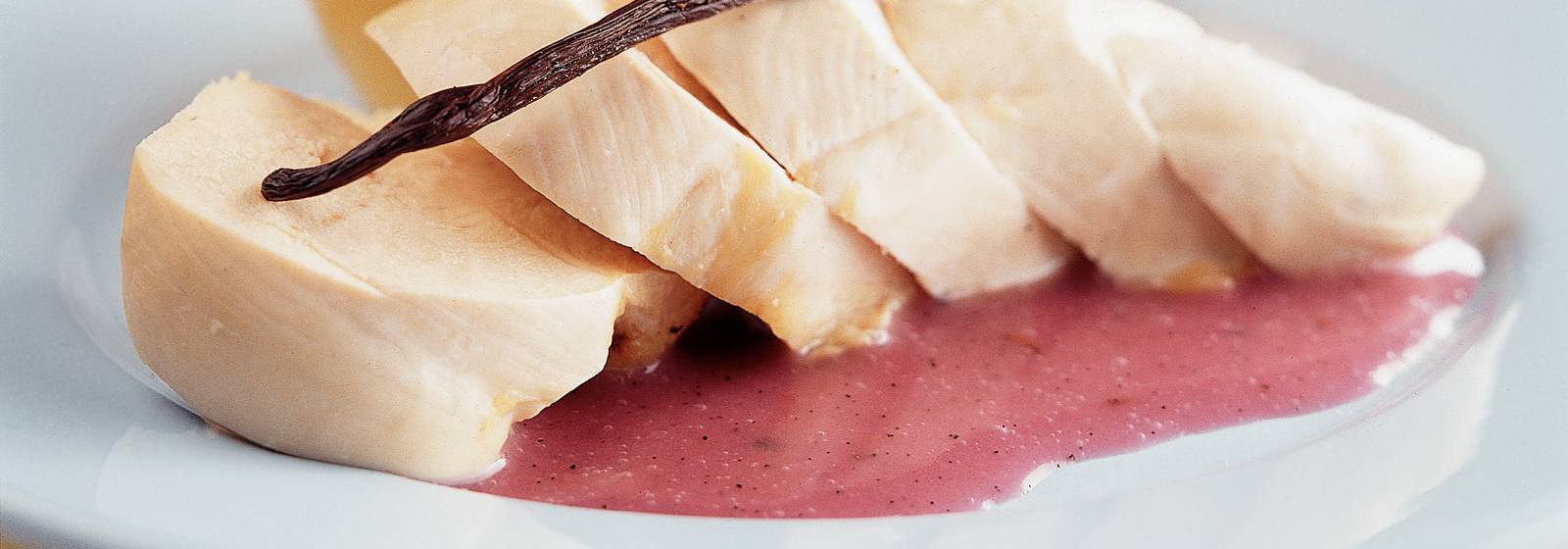 Una sabrosa receta holandesa. El plato principal contiene los siguientes ingredientes: aves, vainas de vainilla, chalote, ajo, apio, aves (380 ml), sal, pimienta blanca, filetes de pollo de maíz (aprox. 150 g), vino tinto claro, mantequilla o margarina y harina.