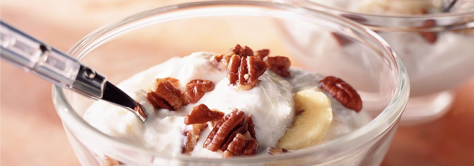 Una receta sabrosa. El postre vegetariano contiene los siguientes ingredientes: pacanas, bananas, quesos biogarde naturales (500 g) y naranja de jarabe de naranja (botella hasta 0 75 litros).