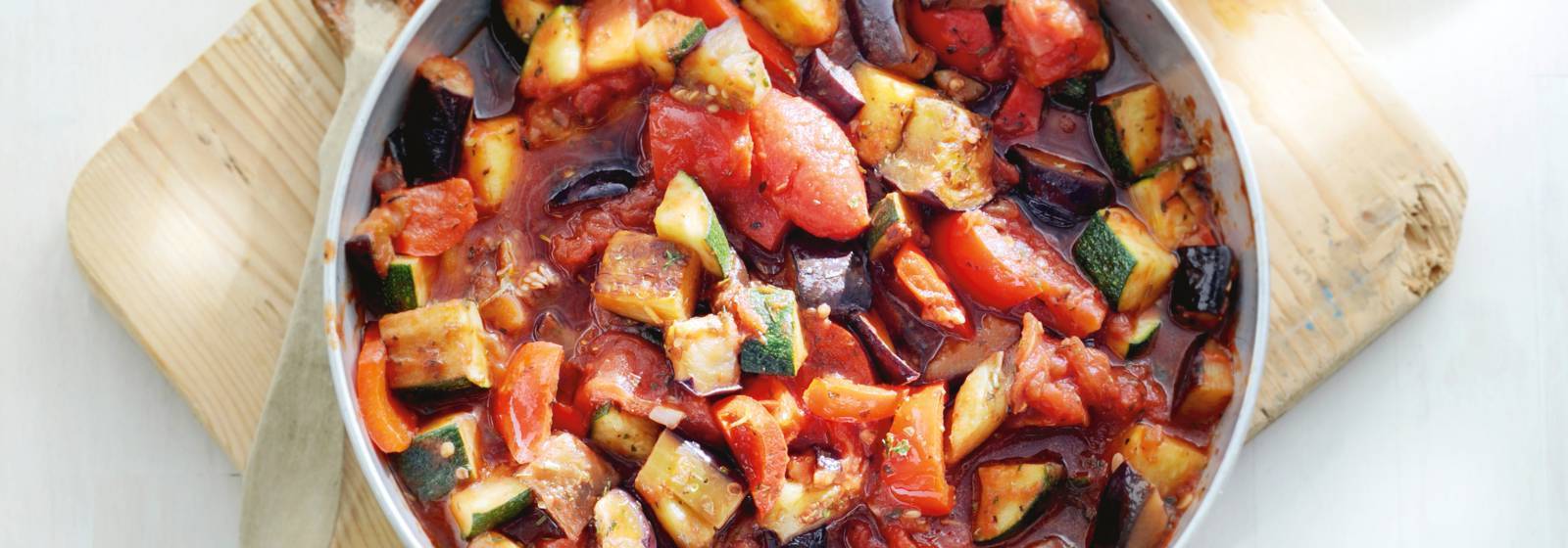 Guiso de verduras de berenjena, pimiento, calabacín, cebolla, tomate y vino tinto.