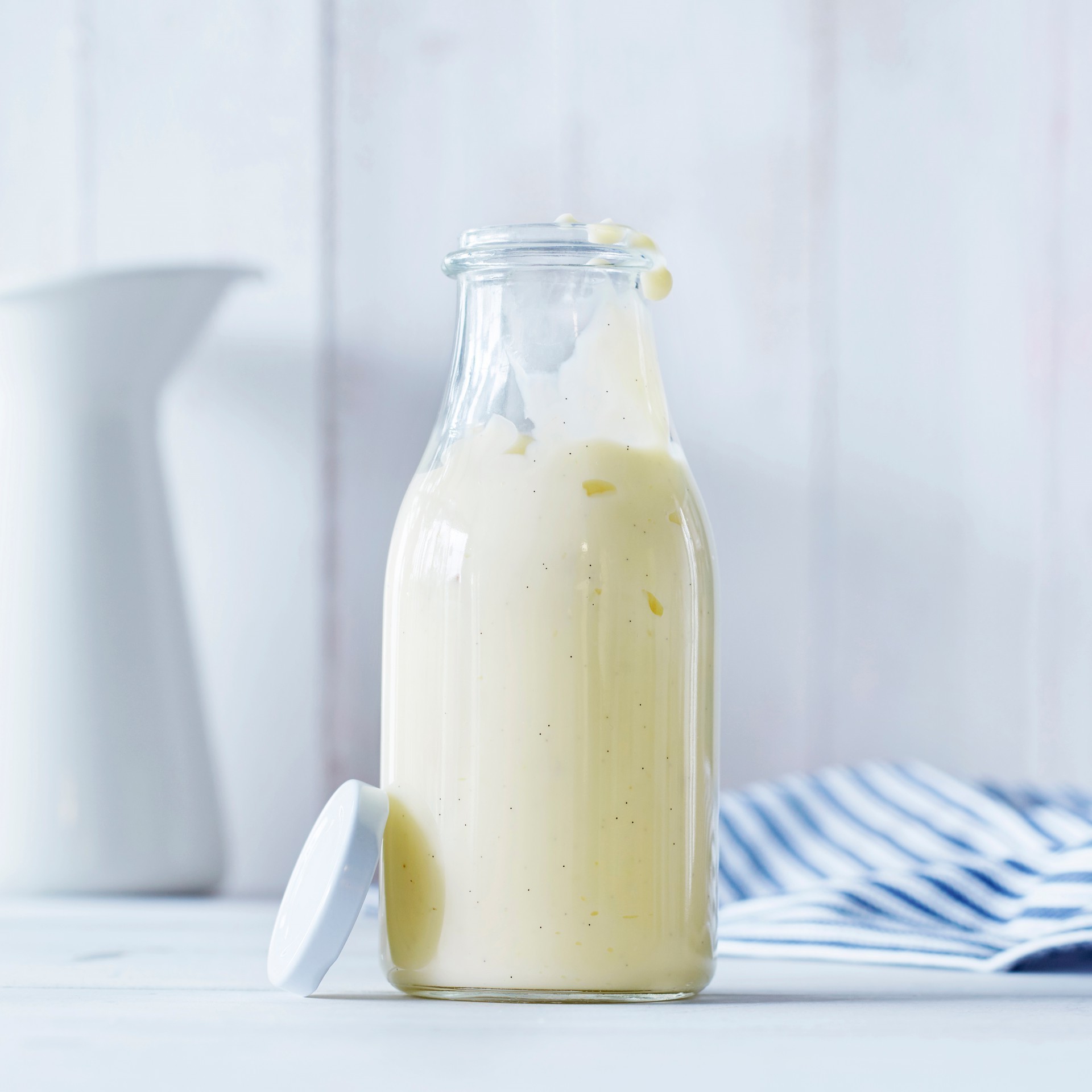 Saque la vaina de vainilla de la sartén y vierta el resto de la leche en un chorro fino mientras golpea constantemente las yemas de huevo. Vierta la mezcla de nuevo en la cacerola y cocine a fuego lento durante un tiempo a temperatura baja.