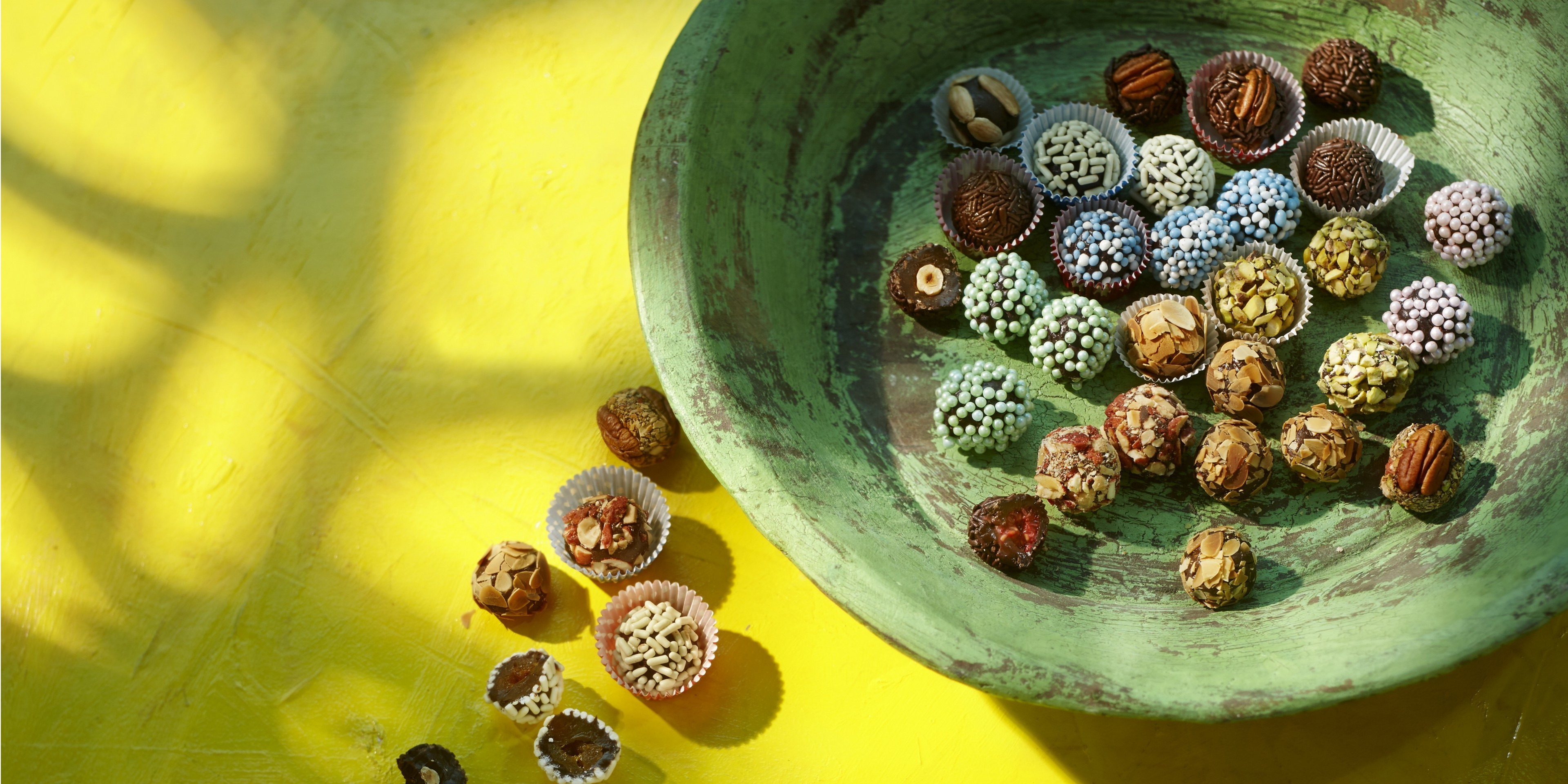 Cortar la mezcla en cuadrados iguales y enrollarla con una mano fría en bolas redondas y bonitas. Ruede directamente a través de la cobertura.