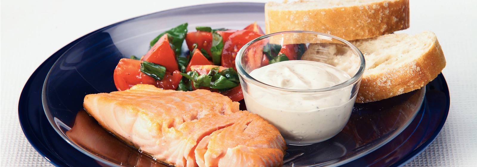 Servir el salmón con salsa, ensalada y pan..
