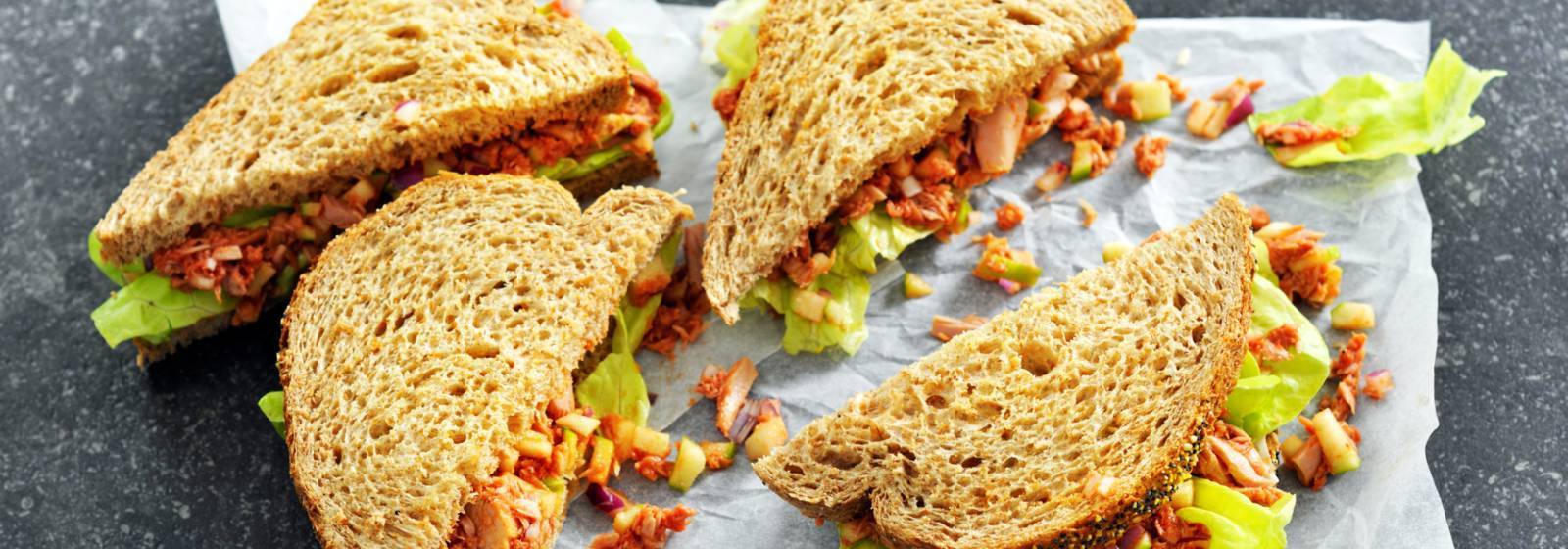 Almuerzo responsable: pan integral con ensalada de atún con puré de tomate, cebolla roja y manzana con lechuga mantecosa.