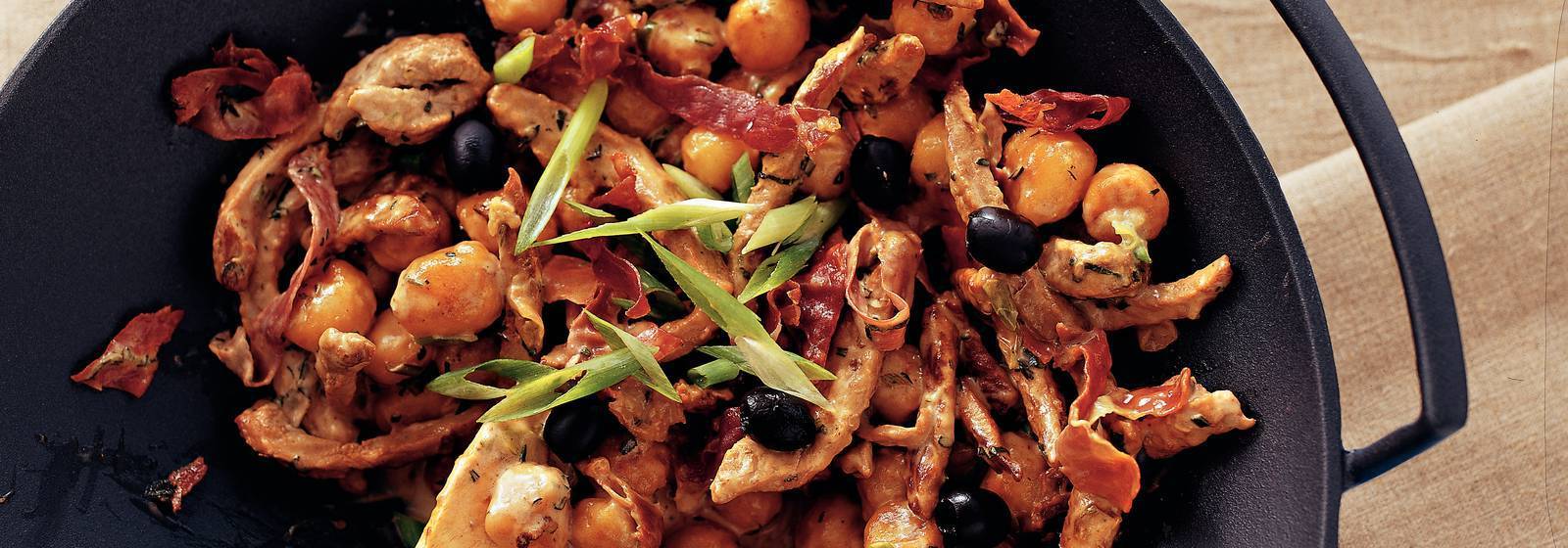 Una sabrosa receta italiana. El plato principal contiene los siguientes ingredientes: carne, cebolletas, licoritos de cerdo, jamón crudo (productos cárnicos), mezcla de especias italianas frescas (20 g), aceite de oliva, mini tarros precocinados (450 g), Marsala (regaliz), crema batida (125 ml), sal y Pimienta y aceitunas negras sin hueso.
