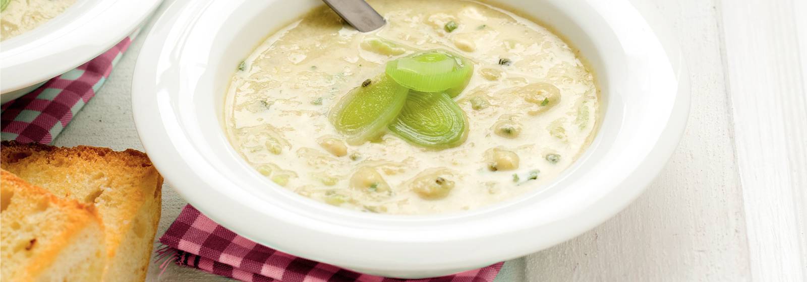 Puré la sopa del fuego con la batidora de mano. Agregue el queso crema y ponga a hervir. Añadir el puerro reservado y calentar durante 2 minutos. Sazonar con sal y pimienta. Servir con la tostada de ajo.
