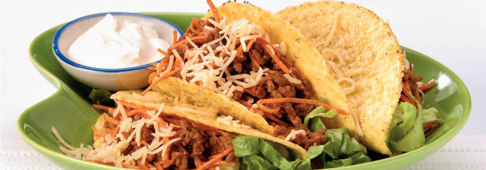 Una buena receta mexicana. El plato principal contiene los siguientes ingredientes: carne, endivias, aceite de girasol, carne molida (extra magra, aproximadamente 450 g), juliana de zanahoria (150 g), mezcla de condimento para tacos (35 g), conchas para tacos (conchas para tacos, 125 g), queso molido (a 150 g) y crème fraîche (125 ml).