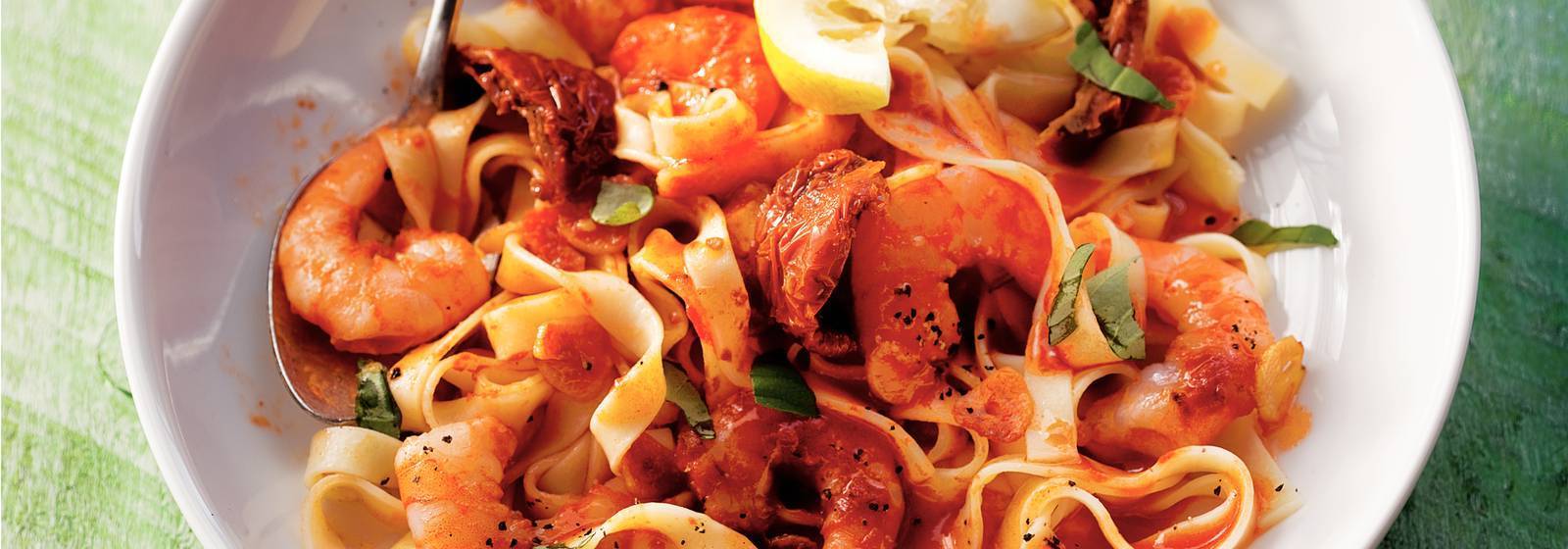Tallarines de pasta con camarones, tomate, albahaca y vino blanco.