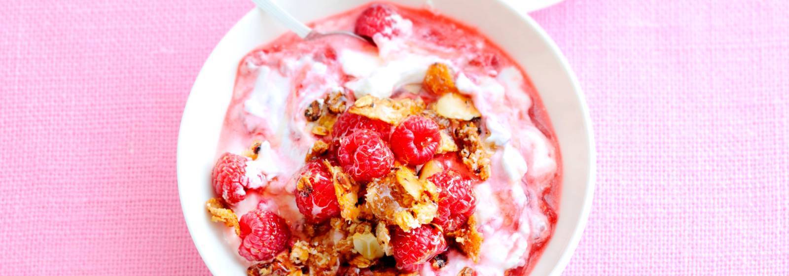 Preparar la mitad de las frambuesas en un bol con un tenedor. Mezclar en el yogur. Repartidas en 4 platos, espolvorea con el crujiente muesli y extiende el resto de las frambuesas sobre él. Rociar con el resto de la miel.