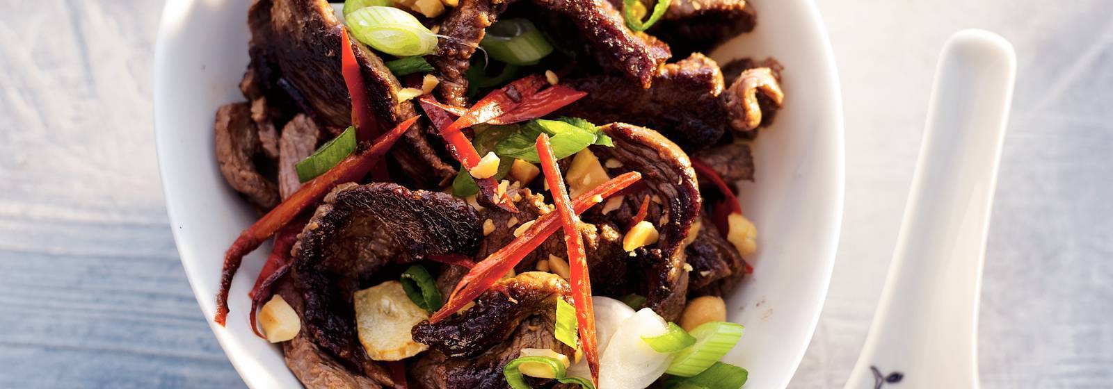 Una receta sabrosa. El plato principal contiene los siguientes ingredientes: carne, pimientos rojos (se quitan las tiras de semillas), bistec Premium (2 piezas), chile (molino), aceite de oliva, ajo (en rodajas), cebolla tierna ((3 piezas), en aros oblicuos), cacahuetes (sin sal y picado).