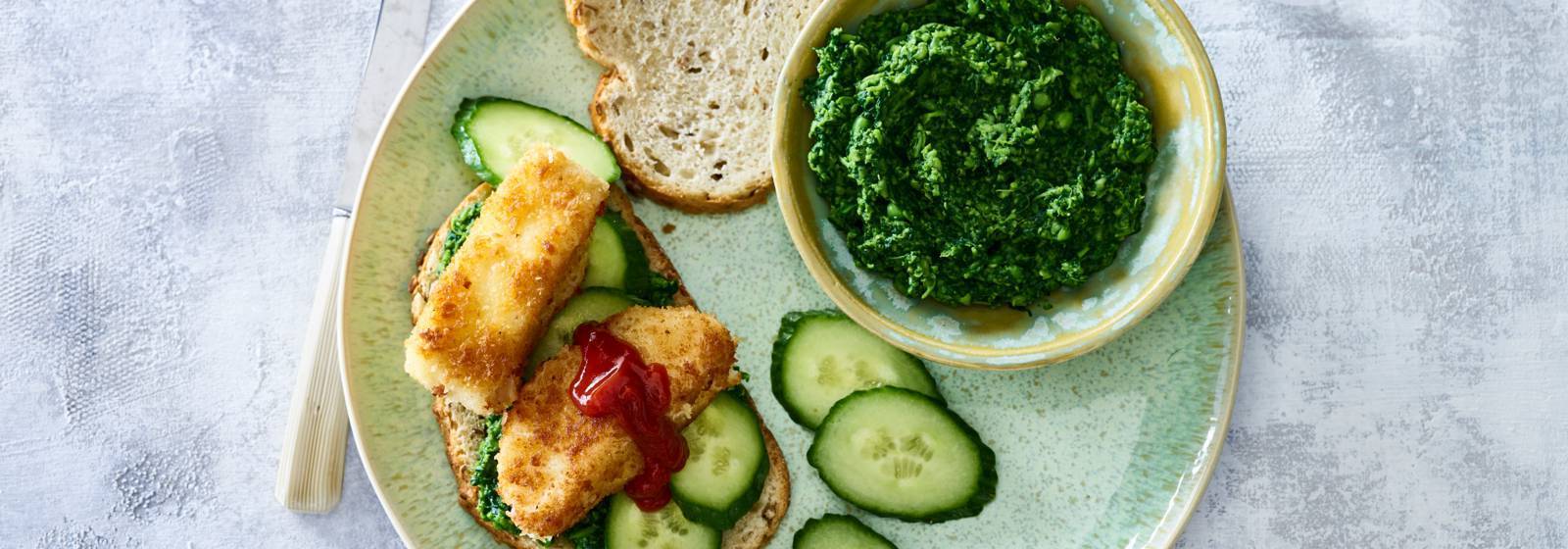 Sándwich de pescado casero y puré de espinacas y guisantes.