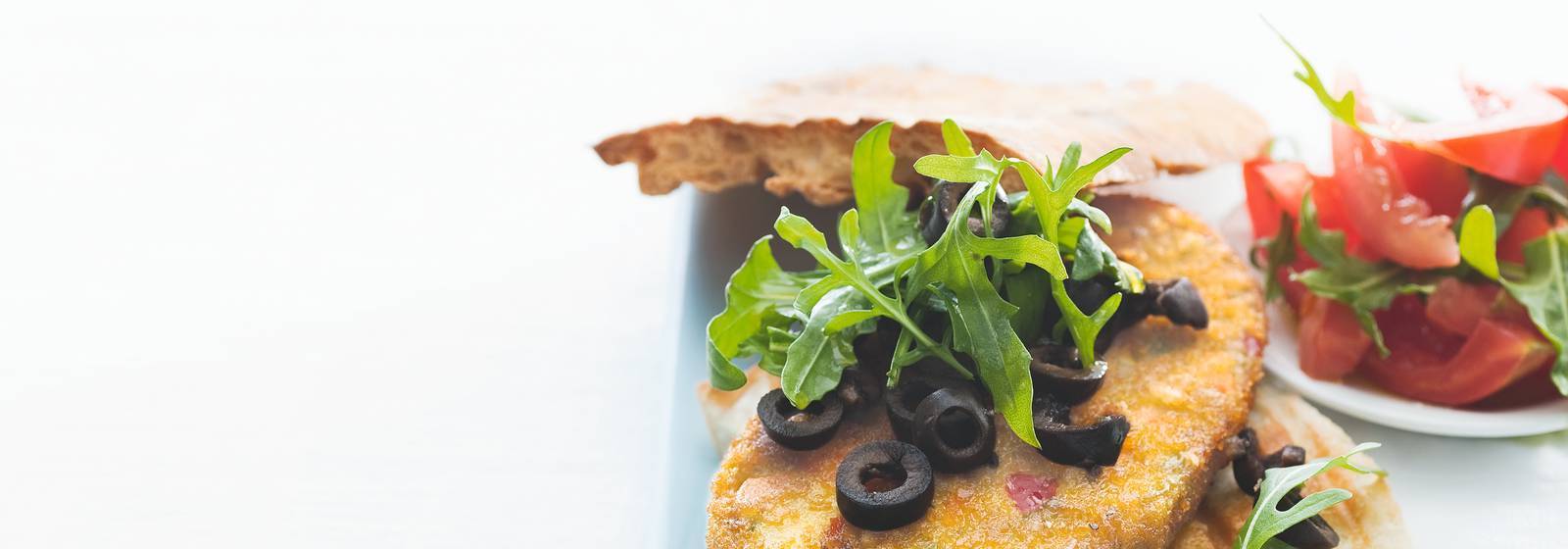 Una buena receta mediterránea. El plato principal vegetariano contiene los siguientes ingredientes: pan ciabatta, aceite de oliva, disco vegetal (a 180 g), tomates, rúcula (75 g), ajo (a la mitad), aceitunas negras ((olla 240 g) y en rodajas).