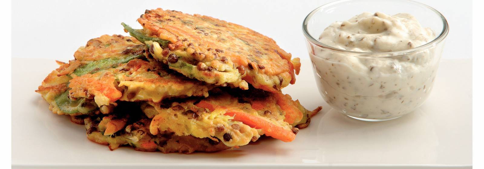 Ponga las galletas de verduras calientes en 4 platos y agregue raita..