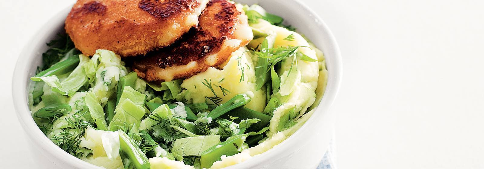 Estampar las patatas con la crème fraîche en un puré suave. Coloque los frijoles, la lechuga y el eneldo. Sazonar con sal y pimienta. Divida el estofado en 4 platos y sirva con los schnitzels de queso.