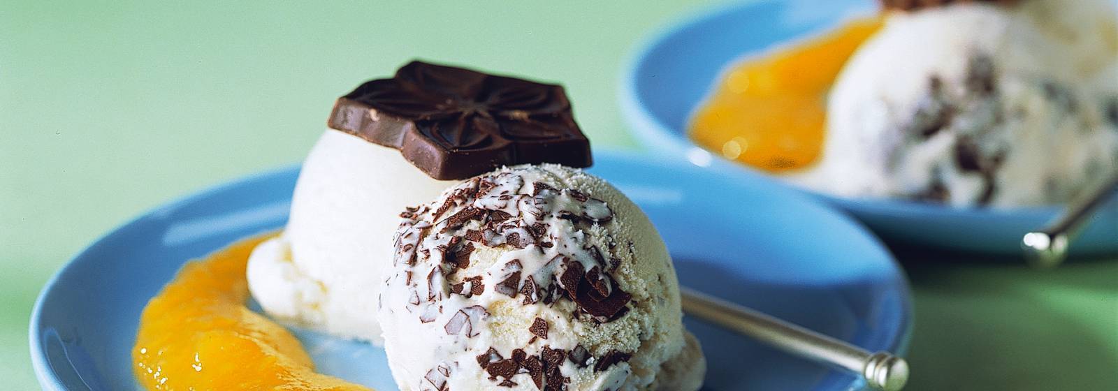 Divida el panecillo helado en cuatro platos. Vierta la salsa de mango a su lado. Decorar con chocolate.