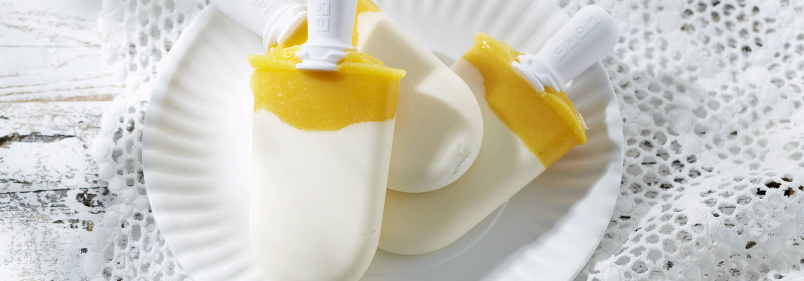 Vierta el yogur lentamente en las cavidades del aparato a 1 cm por debajo del borde indicado. Vierta el puré de mango hasta el borde indicado. Dejar congelar en 10 minutos. Tome el helado fuera del manual del dispositivo y servir inmediatamente o almacenar en el almacenamiento Pop Zoku Quick - o sellado herméticamente en un recipiente o bolsa - en el congelador.