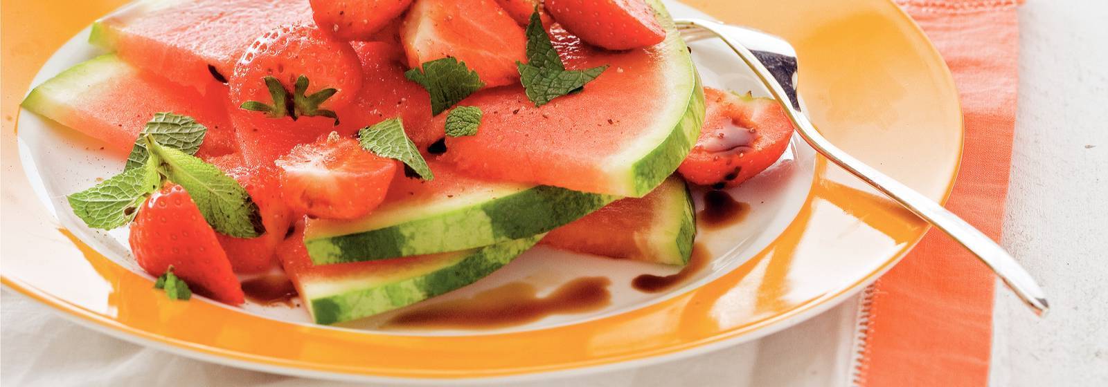 Una sabrosa receta holandesa. El postre vegetariano contiene los siguientes ingredientes: sandía (fruta), fresas, vinagre balsámico y menta fresca (finamente picada).
