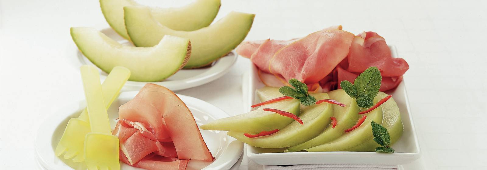 Una receta sabrosa. El acompañamiento contiene los siguientes ingredientes: carne, melón galia, oporto blanco, pimiento rojo (en tiras finas), jamón asado con mantequilla, Yorkham (humo), jamón crudo y menta fresca.