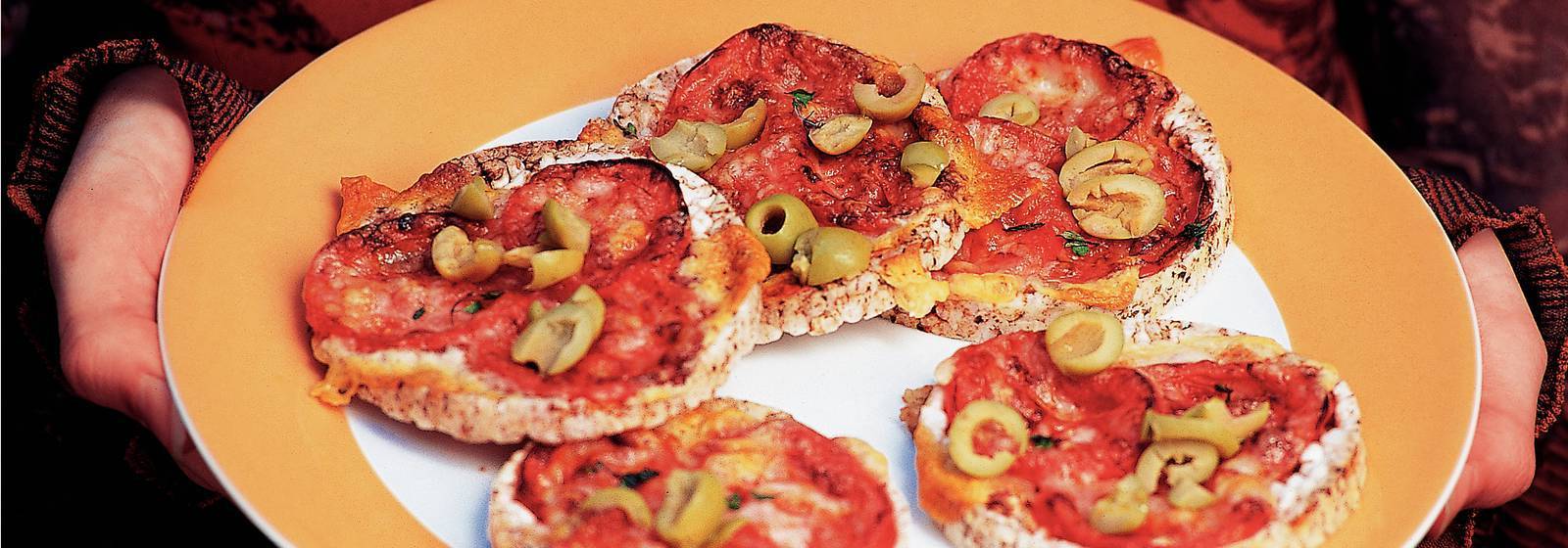Una receta sabrosa. El almuerzo vegetariano contiene los siguientes ingredientes: pasteles de arroz, queso picante ((30), reducido a la mitad), tomates roma (en rodajas), tomillo seco, aceitunas verdes sin hueso (en rodajas) y aceite de oliva.