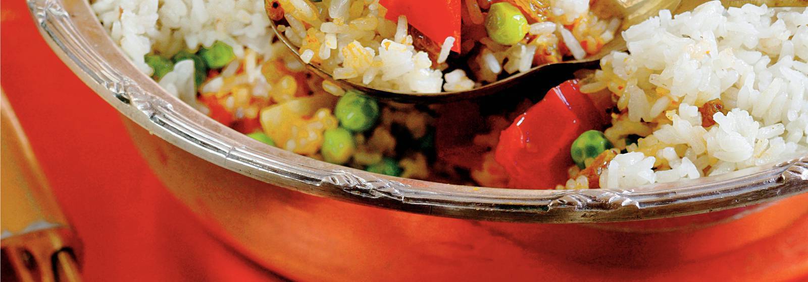 Una buena receta india. El plato principal contiene los siguientes ingredientes: ghee ((punta) o aceite), cebollas (picadas), arroz basmati, canela, cardamomo molido (especias), raíz de jengibre fresco (rallado), pasta de curry indio suave (olla a 283 g), tomates ( en cuatro), guisantes (congelados), yogur entero, pasas y huevos.