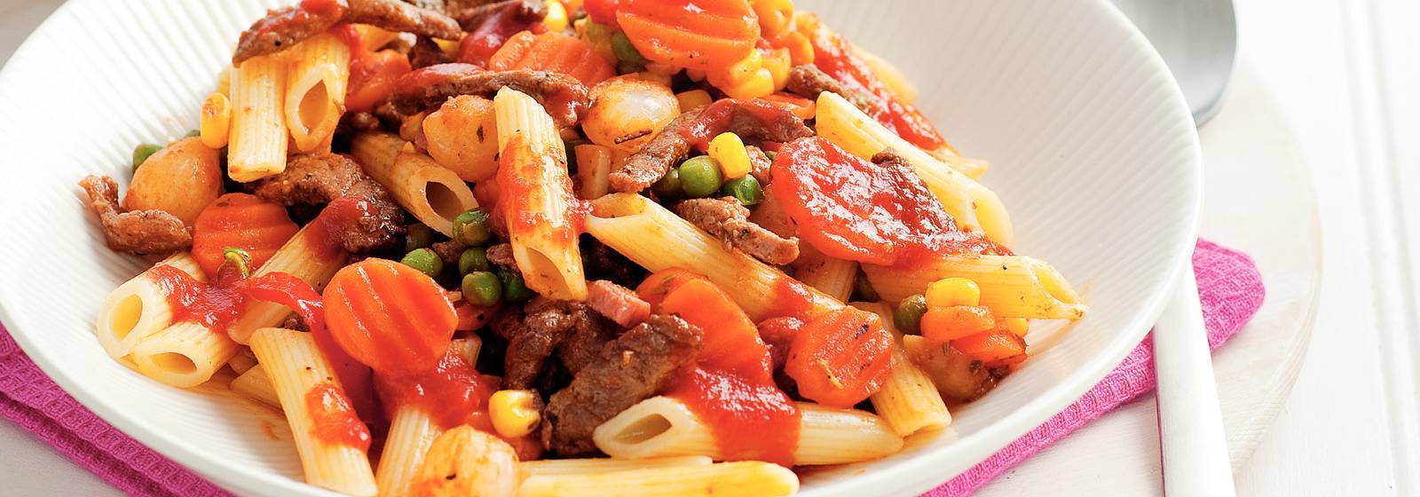 Plato de pasta francesa con tocino, tiras de ternera, verduras salteadas y puré de tomate.