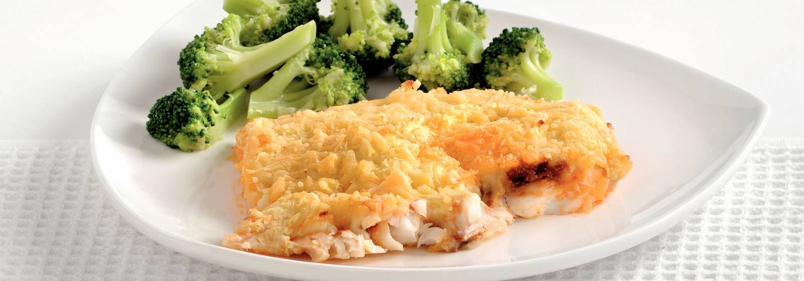 Una receta sabrosa. El plato principal contiene los siguientes ingredientes: pescado, puré de papas (55 g), aceite de oliva, filete de abadejo, tapenade de tomates secos (olla a 140 g), queso (molido 48) y flósculos de brócoli (1 kg).