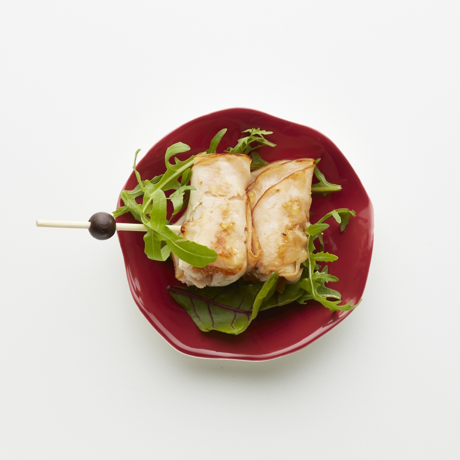 Mezcle 2 cucharaditas de mermelada o mermelada de albaricoque con 2 cucharaditas de mostaza. Cepille las rebanadas de pollo ahumado con ellos. Envuelve estos alrededor de cada albaricoque.