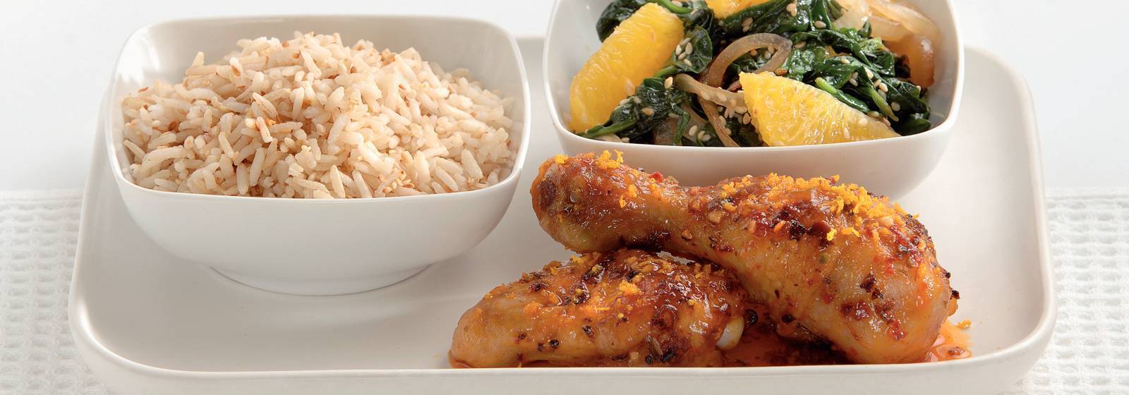 Una receta sabrosa. El plato principal contiene los siguientes ingredientes: pollo, pollo piri piri cazuela (unos 600 g), arroz integral (paquete de 400 g), naranja (fregado), semillas de sésamo (tarro de 45 g), aceite de girasol, cebollas (en anillos), ajo (en Rebanadas) y espinacas (a 300 g).