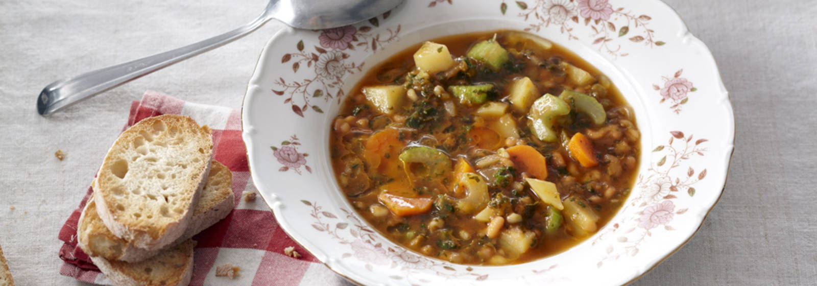 Asar 8 rebanadas de pan ciabatta en la tostadora. Rocíe la sopa con mucho aceite y sirva con el pan.