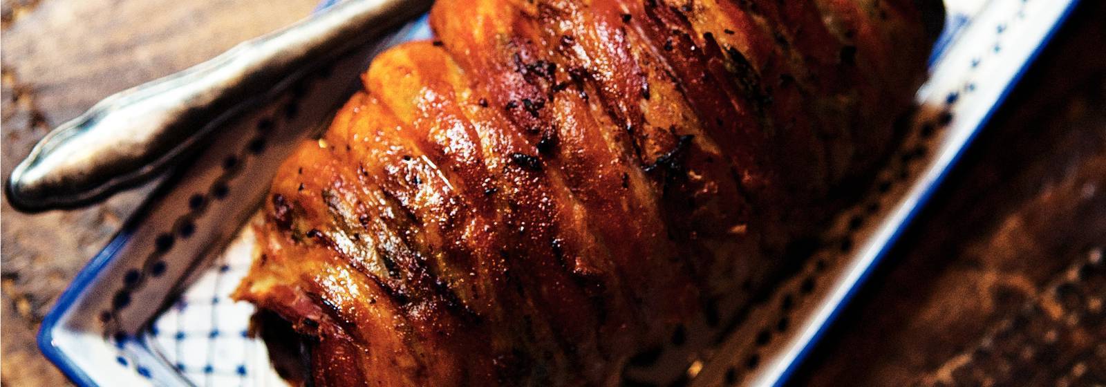 Empuje la carne, cepille con el aceite de hierba restante y envuelva con tocino.